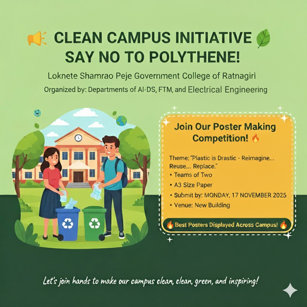 The students of the Second Year from the Departments of AI&DS, Electrical Engineering, and FTM, together with NSS , are organizing a “Clean Campus – Say No to Polythene” initiative to promote environmental awareness and Universal Human Values among students. As part of this program, a Poster Making Competition and a Campus Cleanliness Drive have been scheduled.